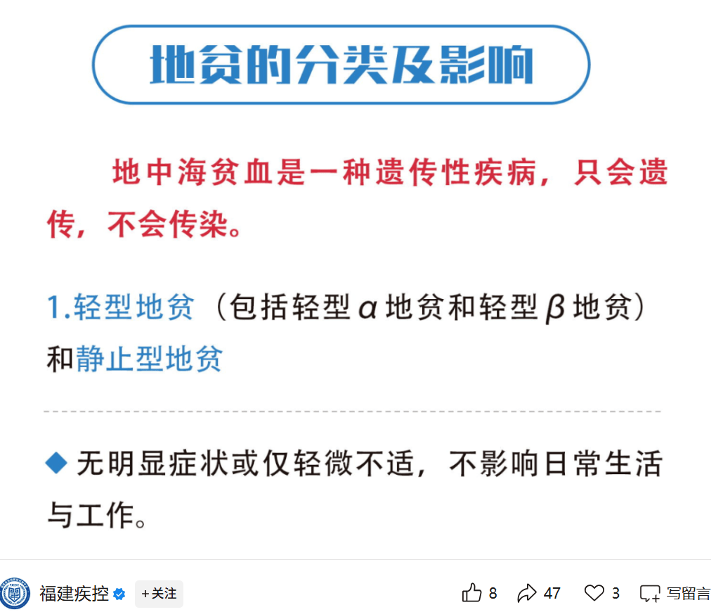 福建疾控微信公众号曾发布科普,强调地中海贫血是一种遗传性疾病,只会遗传,不会传染。明确了轻型地贫和静止型地贫,无明显症状或仅轻微不适,不影响日常生活与工作。