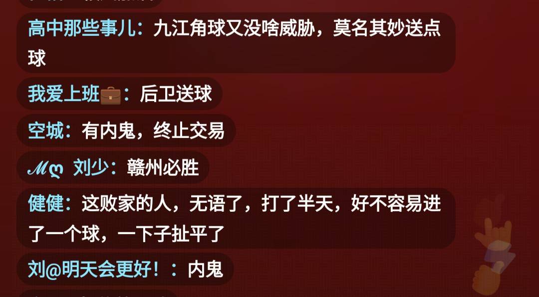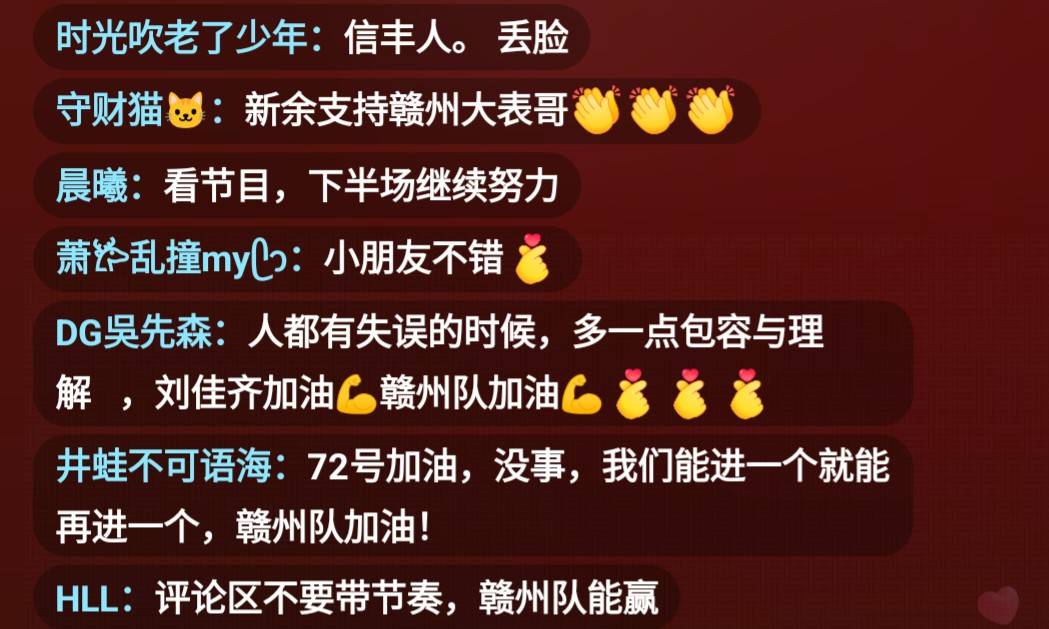 点球进后,部分赣州球迷在直播间内发表了激烈的言论,弹幕中出现了“后卫送球”“内鬼”“九江角球没威胁,莫名送点球”等不满的声音。与此同时,也有一些理智的球迷表示:“人都有失误的时候,多一点包容与理解,刘家齐加油!赣州队加油!”这样的弹幕为刘家齐和赣州队加油鼓劲。
